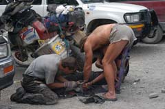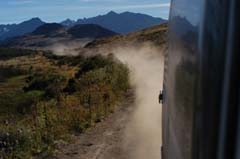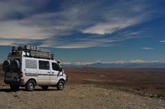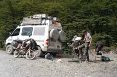 | Hier oben trafen wir Marc und Paul aus Holland auf ihren Crossmaschinen. Allerdings hatte Marc ein komplett gebrochenes Bein mit einem Spezialgips und Paul hatte gerade einen Platten und kurze Zeit später Probleme mit der Antriebskette. Auf diesen einsamen Pisten hält jeder an und fragt ob man behilflich sein kann, denn die Strecken zum nächsten Ort sind oft gleich mal 40, 50 oder 100 Kilometer. |