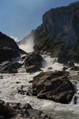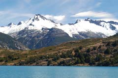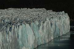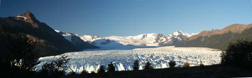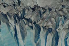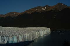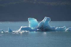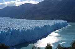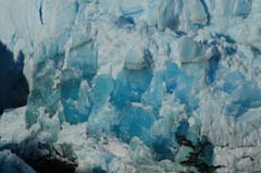 | ... dafür ist das Weiß und Blau d. Morenogletschers ein Erlebnis. Und mit etwas Glück erlebt man das Kalben an der Front. Wir sahen drei Mal den Abbruch einer fast 40 Meter hohen Front. |