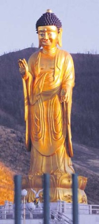 hängen bleibt. Nachdem wir uns ausgerechnet zur abendlichen Hauptverkehrszeit auf 13 Kilometern in rund 3 Stunden durch das Zentrum gekämpft hatten, fanden wir am Fuß Tuul in der Nähe und unter Obhut des 16 Meter hohen goldenen Buddhas eine Übernachtungsmöglichkeit. Jedenfalls nach diesen 13 Kilometern und am deutschen Verkehrsrecht gemessen, hätte ich gleich mehrfach die Fahrerlaubnis verloren. Mindesten 3-4 Mal sind wir bei roter Ampel über die Kreuzung, mehrfach die Fußgänger von ihren Zebrastreifen